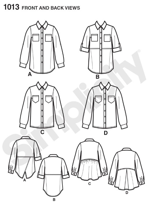 Misses button front shirt features fabric mixing and cross-over, basic, gathered or pleated back shirttail. Sleeve can be long or rolled up with tab closure. Simplicity sewing pattern.