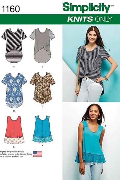 Top pattern for miss and miss plus can be high low with cross in the front and lace sleeve option, tee shirt with option of shirttail hem or center front seam, or tank top with lace options.