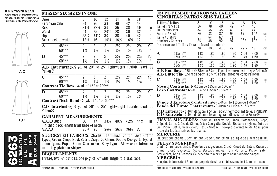Misses' sleeveless a-line dress features a notched neck line with and without a bow. View C can be made without notch and long bow or view D can be made with a contrast band. New Look sewing pattern.