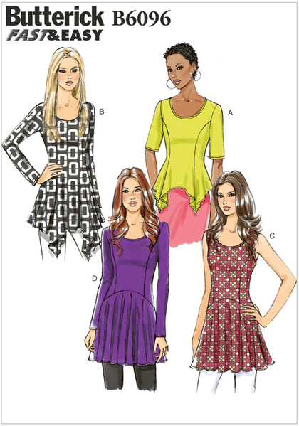 MISSES' TOP: Semi-fitted, pullover tops have princess seams, sleeve variations and narrow hem. A,B: shaped hemline. C,D: shaped flounce.