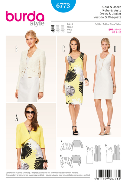 Sleeveless dress and matching jacket, inviting you to mix and match at will colors, patterns and weaves - generating exciting contrasts. Short jacket A or lengthened variant B with stitched-in hem band.