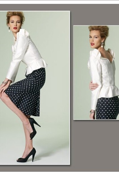 Fitted, lined, boned top has front extending into pleated collar, self-lined, pleated peplum, long, two-piece sleeves with darted cap, underarm gusset, and front extension with hook/eye closing. Bias front and side front. Semi-fitted, lined skirt has waistband, back godet extending to lower side front, and invisible back zipper.
