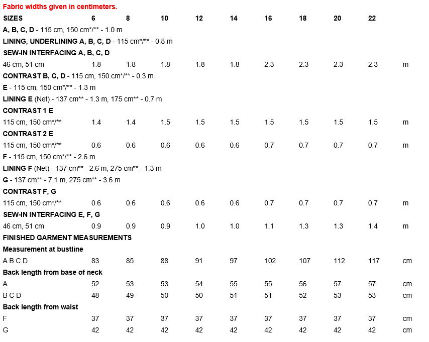 FABRICS: A, B, C, D, Contrast 2E, Contrast F,G: Satin, Silk, Taffeta, Lightweight Brocade, Jacquard. Contrast B, C, D: Lace. Lining A, B, C, D: Lining Fabric. Underlining A, B, C, D: Muslin, Ticking. E, F: Lace, Organza, Novelty Tulle. Contrast 1E: Organza. G: Tulle. Lining E, F: Net. Interfacing: Sew-In.