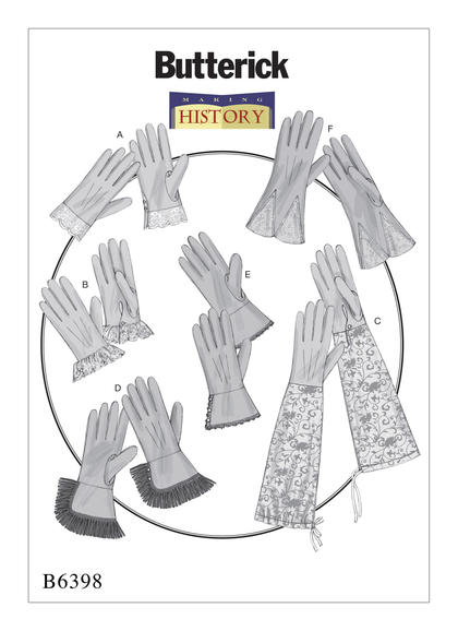 Gloves A have lace trim and side button opening. Gloves B have lace trim and front button opening. Gloves C have contrast lace sleeve with adjustable casing and front button placket. Gloves D, E have cuffs with side button opening and purchased fringe or braid trim. Gloves F have contrast lace overlays.