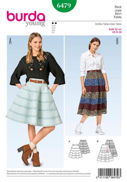 Crosswise skirt panels lend a special touch to this Misses' skirt with bell-like fullness. Fringed fabric strips are caught in at the panel seams on View A. Lace skirt View B is lined and designed in color blocking.