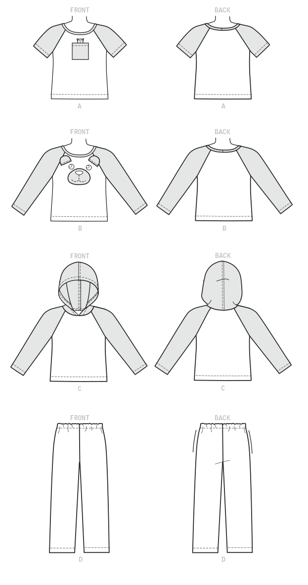 Tops have contrast raglan sleeves with length variations and stitched hems. A: Contrast neckband and pocket. B: Contrast neck band, bear face with contrast ears and muzzle. C: Contrast hood. Pull-on pants have elastic waist, side pockets, and stitched hems.