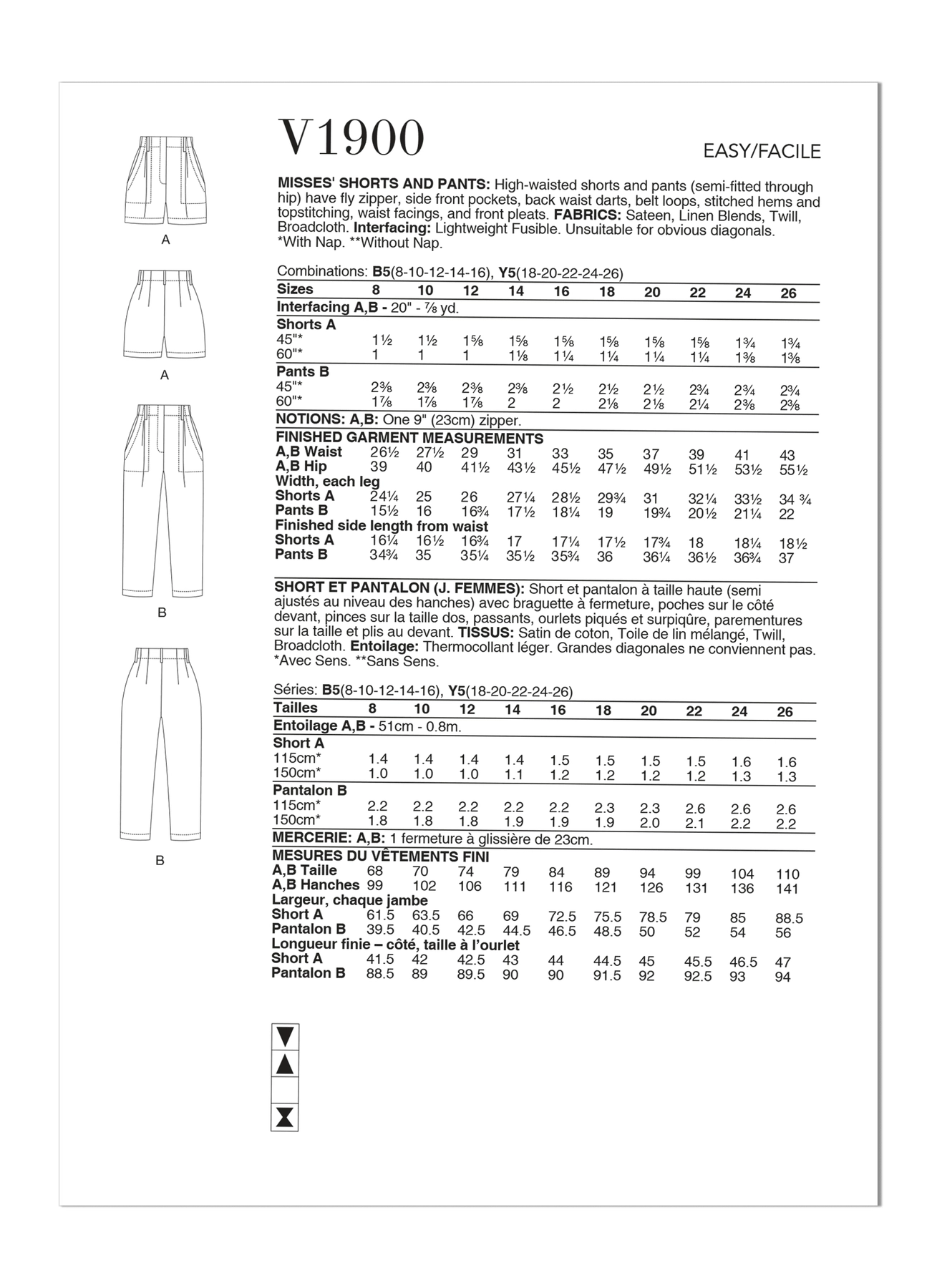 High-waisted shorts and pants (semi-fitted through hip) have waist facings, front pleats, fly zipper, side front pockets, back waist darts, belt loops, stitched hems and topstitching.