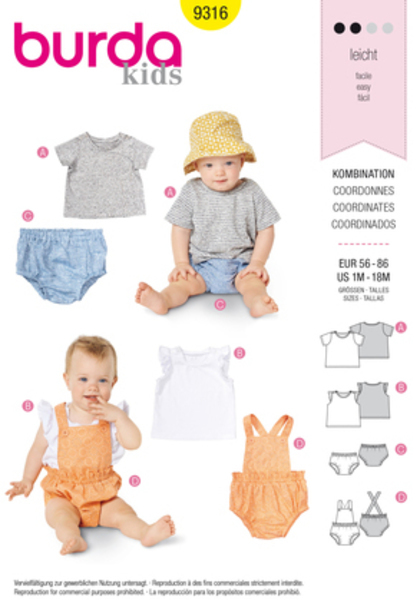 A comfortable and practical outfit for babies. Snap fasteners at the shoulders of the tops make them easy to put on and take off. The wide-leg panties can be made up with or without a bib.