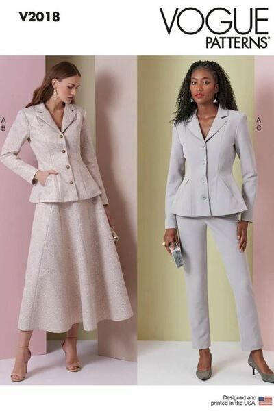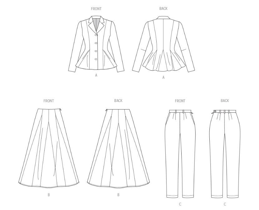 Fitted, lined peplum jacket has front button closure, notched collar, godets and front in-seam pockets. Skirt B has waist facings, side front, side back, center front and center back seams with godets and invisible side seam zipper. Tapered pants (fitted through hips) have a side button waistband, slanted pockets and invisible side zipper.