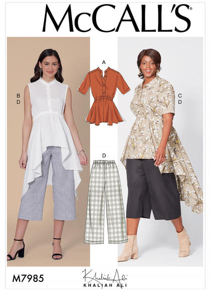 Very loose fitting top and tunics have self faced yoke with forward shoulder, upper and lower fronts with inside casing for drawstring, neckband, front button closing and narrow hems. A, C: Sleeves. B: Bias tape armhole finish, purchased trim. B, C: Shaped hem, wrong side shows. C: Collar and side slits. Straight-legged, semi-fitted pull on pants have elasticized waist, side seam pockets and stitched hems.