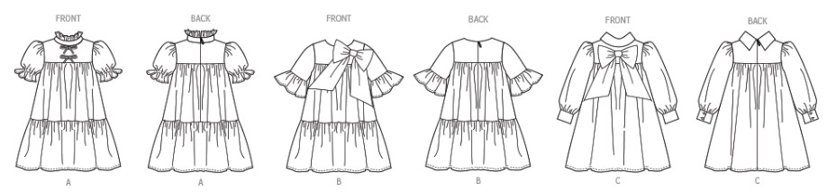 Lined dresses have sleeve and neck variations and invisible back zipper closure. View A has ribbon bows. Views B and C have self-fabric bows. View C has button cuffs.