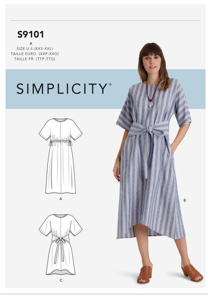 Misses' pullover dresses in two lengths. A: drawstring waist. B:,C: front wrap tie belt.