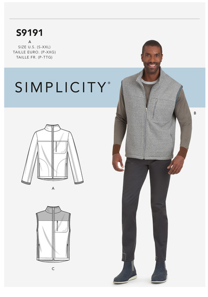Men's vests & jacket with stand collar, separating zipper, pocket details & side panel; vest c is color blocked.