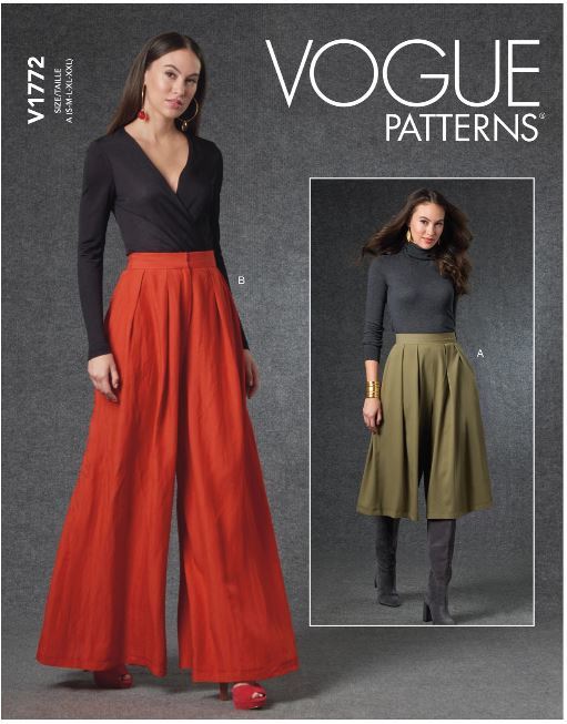 Misses' very loose-fitting pants have soft pleats & side seam pockets, stitched hem. A: invisible back zipper. B: mock fly front. A,B: waistband hook & eye closure.