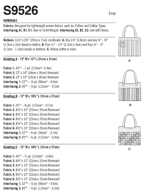These crafty handbags are fashionable & fun to make. Using a variety of your favorite fabrics, you can create a bag you're thrilled to wear. Bag A is 12" (31cm) x 12" (31cm), bags B & C are 12" (31cm) x 10'" (27cm).