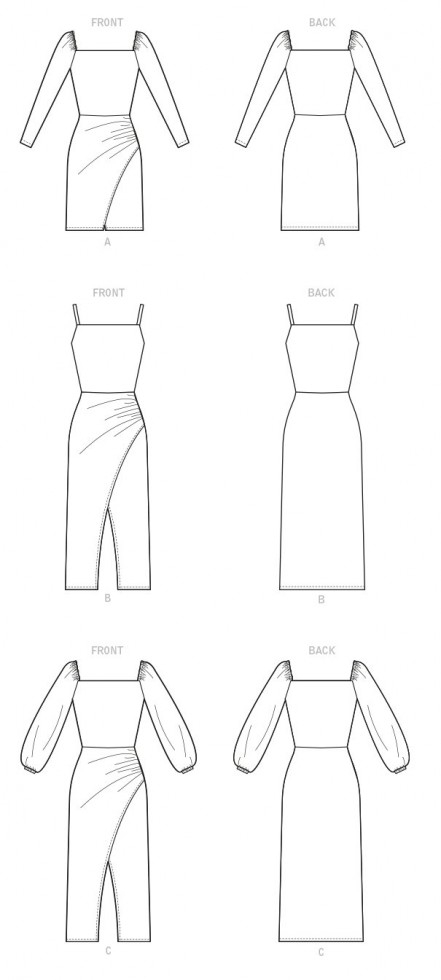 Misses' & women's knit pullover dress with faux ruched wrap sarong skirt. Elastic at A & C sleeves. Spaghetti straps for view B.