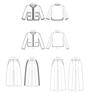 Misses' fitted, lined jacket has purchased braid trim, shaped side slits, two-piece sleeves, bust darts, patch pockets. Wide leg pants, semi-fitted through hip, have side front pockets, fly front, length variations. C: grosgrain trim. Complete the look with this trim.