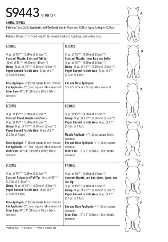 Cute and absorbent 24" long cat and dog towels have arms that drape over the towel bar and snap close, sewn from two layers of terry cloth with appliques to create different types and breeds.