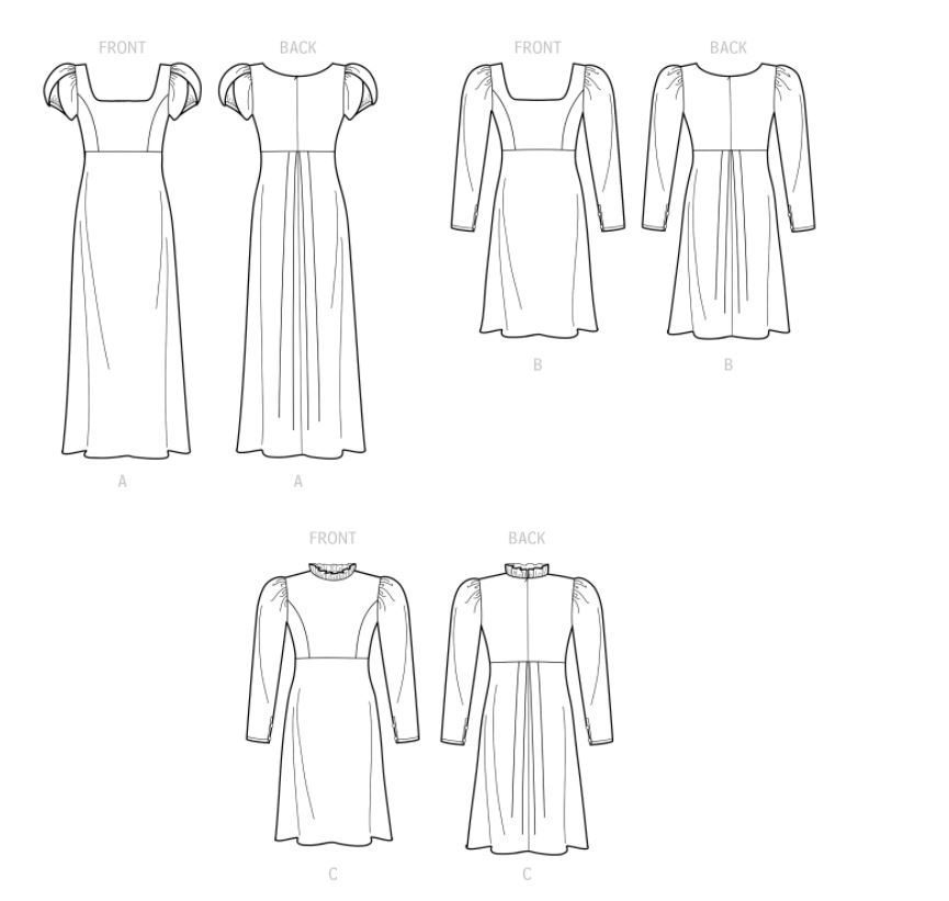 A-line empire dress in two lengths has low shaped neckline or high ruffled neck. Tulip shaped, short puff and long puffed sleeve options included.