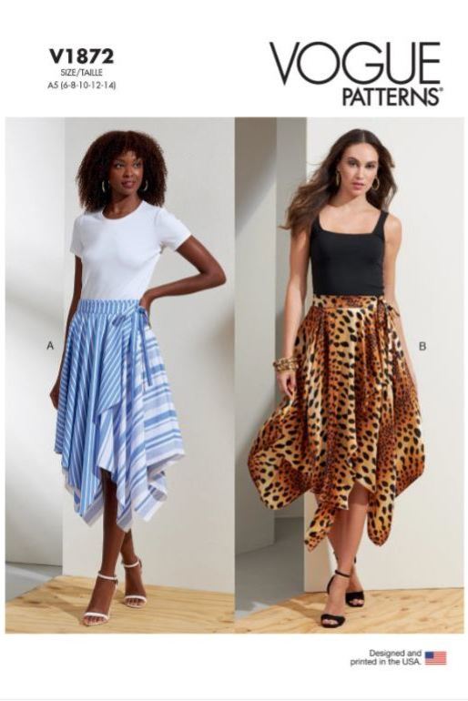 Very loose-fitting, asymmetric wrap skirt has waistband, side wrap tie, handkerchief hemline and baby hems. View A has contrast.