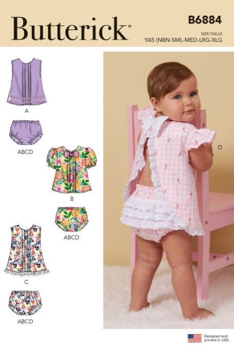 A-line top has front stitched tucks, back button closure and sleeve variations. Panties have elastic waist, legs and ruffles on back.