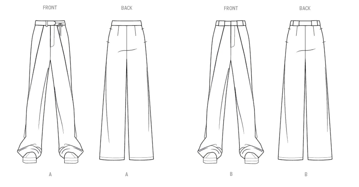 Angled front wrap pants have waistband with belt carriers, front fly zipper with hook and bar closure, side seam pockets and back darts. View A has belt sewn into side seam and self-ties attached to the waistband.