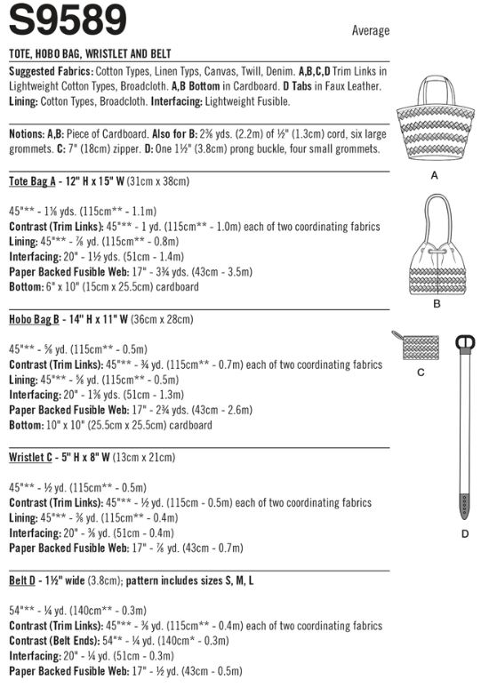 Lined tote has oval base and fabric handles; hobo bag has grommets, cord strap and drawstring closure with fabric slide. Lined wristlet has zipper. Belt with purchased buckle and eyelets has faux leather tabs fits and fits misses' sizes S-M-L. All accessories are embellished with interlocking folded fabric links, created using coordinating fabrics.