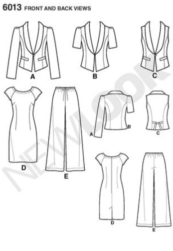 Misses' jacket with sleeve length variation features a gathered, puffed shoulder, and single button closure. Can be made as a vest. Cap sleeved fitted dress with back zipper, and wide-leg elastic waist pants also included.