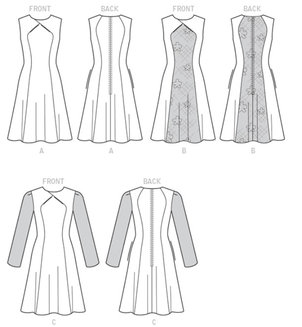 MISSES'/MISSES' PETITE DRESS: Dress (semi-fitted through bust) has princess seams, side-fronts overlapped at neckline, side pockets, and back zipper. B: Front and back overlays.