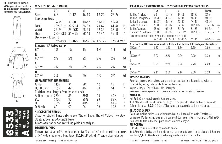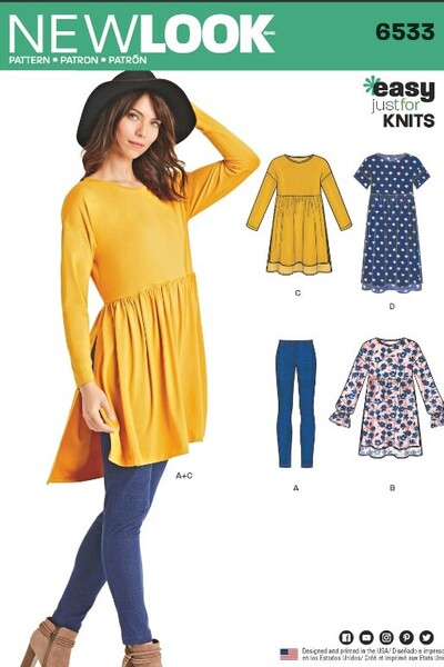 Misses' babydoll dress or top features length and sleeve variations with optional side slits. Pattern also includes leggings. New Look sewing pattern.