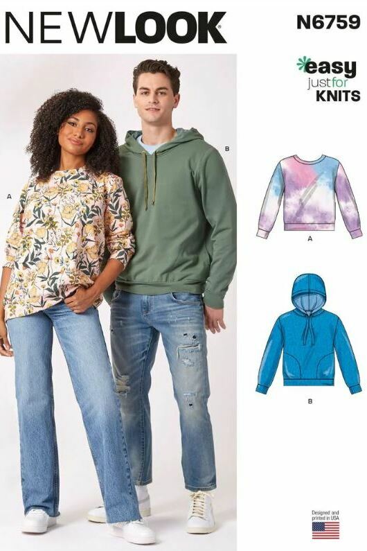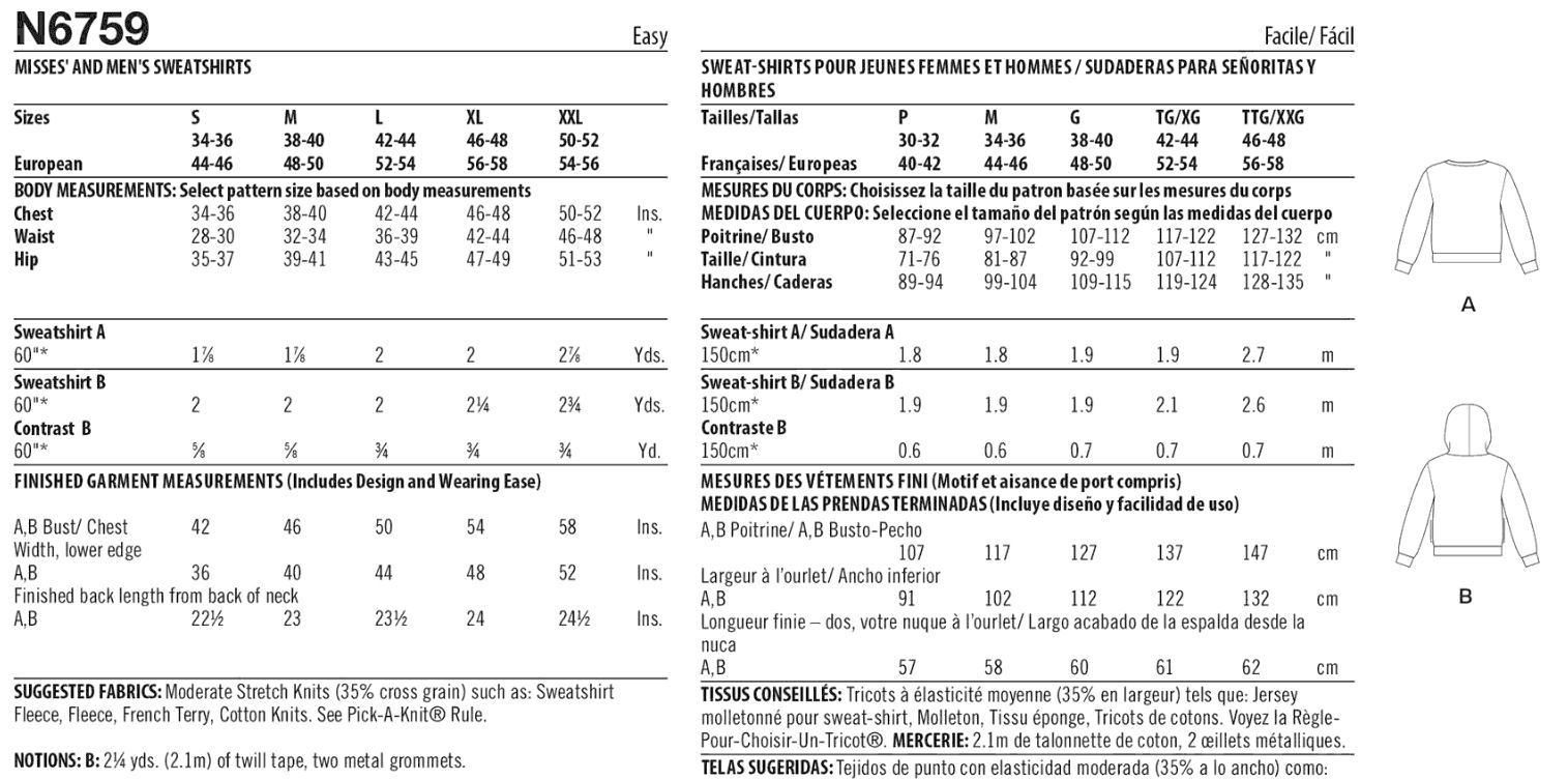 Easy to sew sweatshirt with or without hood. Top with hood has contrast lining, drawstrings and side seam pockets. Fit based on Men's sizing.