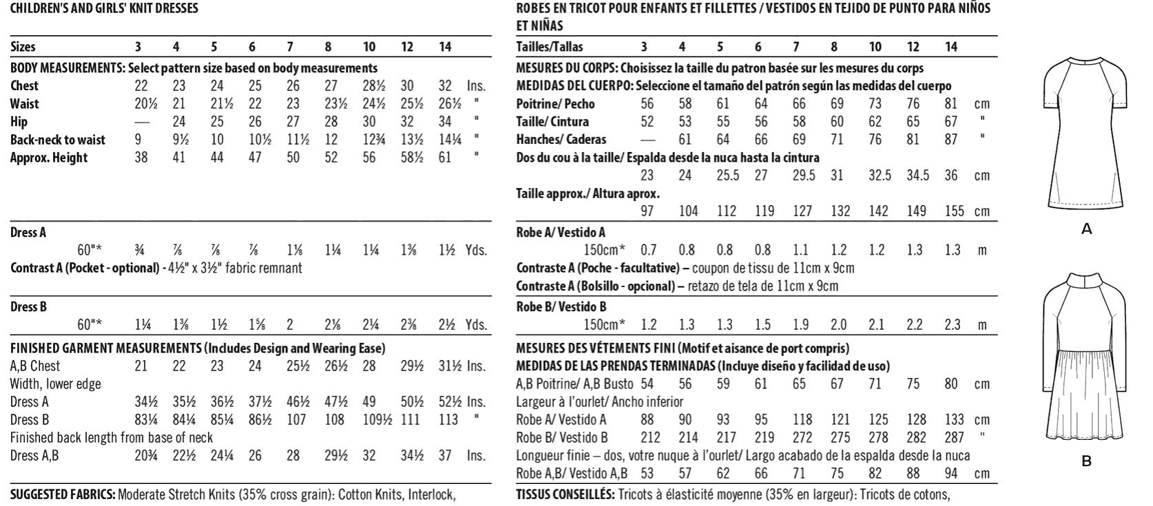 Easy to sew children's and girls' dresses. Dress A has a front patch pocket and short raglan sleeves. Dress B features gathered skirt and long raglan sleeves.