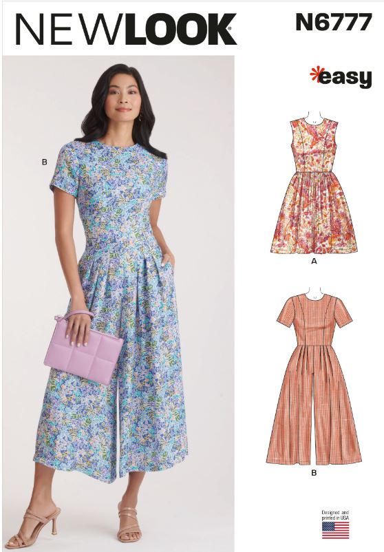 Dress and jumpsuit have close-fitting, lined bodice with princess seams, round neckline, side pockets, stitched hem, and back zipper. View A: Sleeveless dress with gathered skirt. View B: Jumpsuit, cropped wide leg, short sleeves.