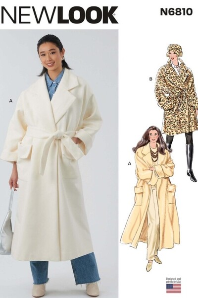 Oversized lined swing coat in ankle or knee length has long batwing sleeves with turned up cuffs, shoulder pads, patch pockets with flaps and dramatic notched collar. Coats can be worn with or without self-fabric tie belt.