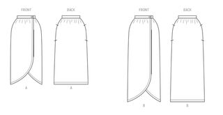 Straight wrap skirt has slim fit with front and back gently gathered into waistband and side front button closure. Both mid-calf and ankle length options have tulip hemline with top stitched narrow hem and side seam pockets.