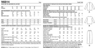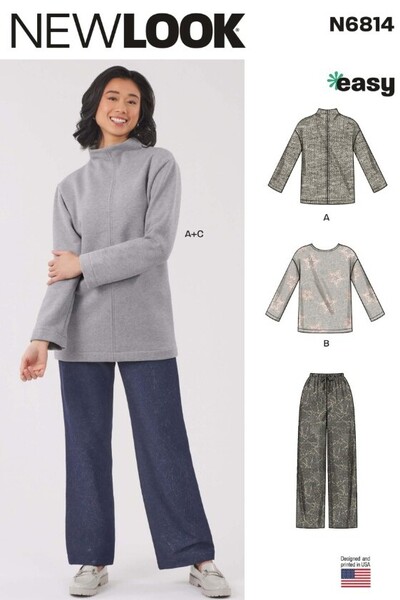 Pullover knit tops have boxy fit, dropped shoulders and long sleeves. Funnel neck top has back neck zipper, front and back seaming and top stitched details. Wide round neck top has easy turned back hems. Relaxed fit pull-on full-length trousers have applied ribbon casing for elasticised drawstring with fabric tie ends.