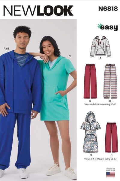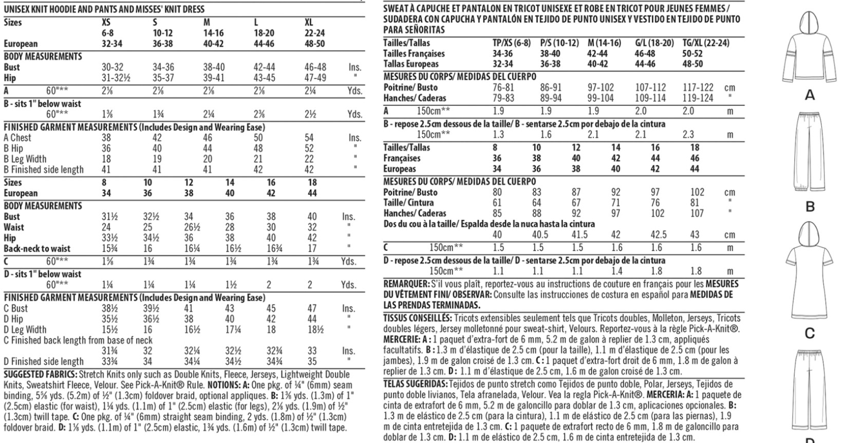 Knit hoodie has drawstring, kangaroo pocket, purchased trim, and optional appliques. Pull on trousers have elastic waistband with drawstring and hem variations. Hooded knit dress has short sleeves kangaroo pocket and purchased trim.