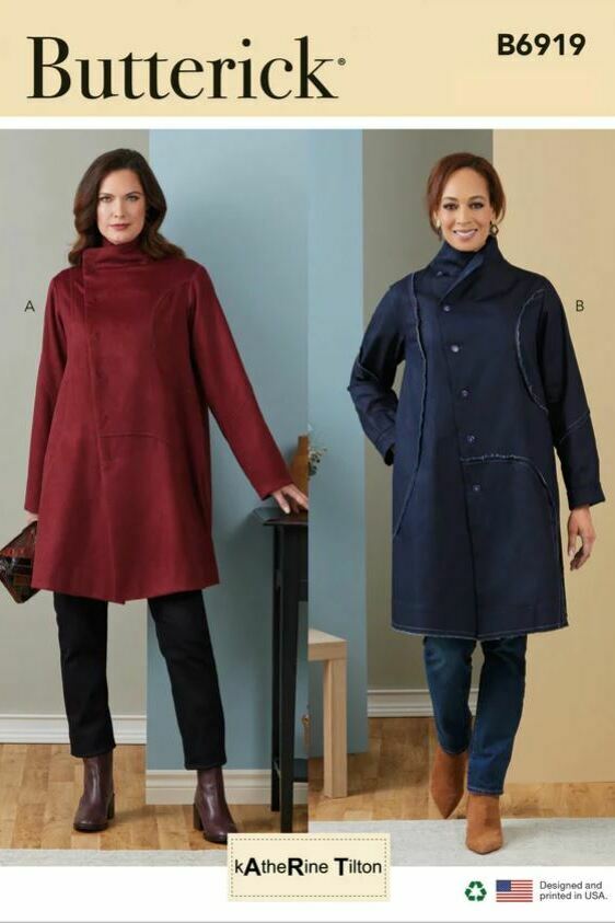 Asymmetric coat has side seam pockets. View A has topstitching around the seams with hidden snap closure. View B has raw edge outside seams and front buttons.
