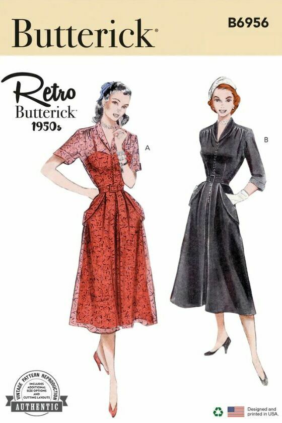 Vintage Butterick 1950'S dress sewing pattern. Soft one-piece dress with four gore skirt. Bodice softly gathers to shoulder seams, has a tiny shawl collar and short or three-quater sleeves. Four-gore skirt has top flap pockets and a single inverted pleat. Authentic Vintage Reproduction includes additional size options and cutting layouts.
