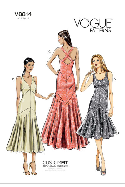 Lined dress has neckline variations, bias bodice/lower front and back, and back zipper.A, B, C, D cup sizes.Note: no provisions provided for above waist adjustments.