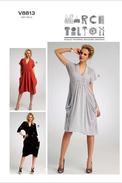Pullover dress (semi-fitted through bust) has gathered front extending into back collar, side front seams, draped lower side front with pockets, and stitched hems