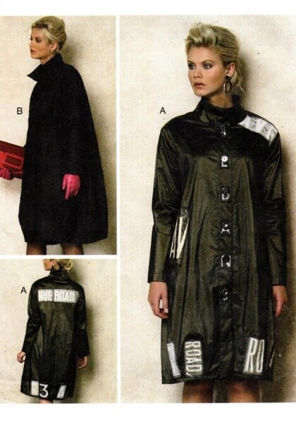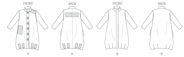 MISSES' COAT: Loose-fitting coat has collar, side pockets, hemline darts, and front button closing. A: unlined, front band, patch variations, and stitched hems. B: lined, fly front closing. FABRICS: Wool Flannel, Raincoat Fabric, Linen, Canvas.