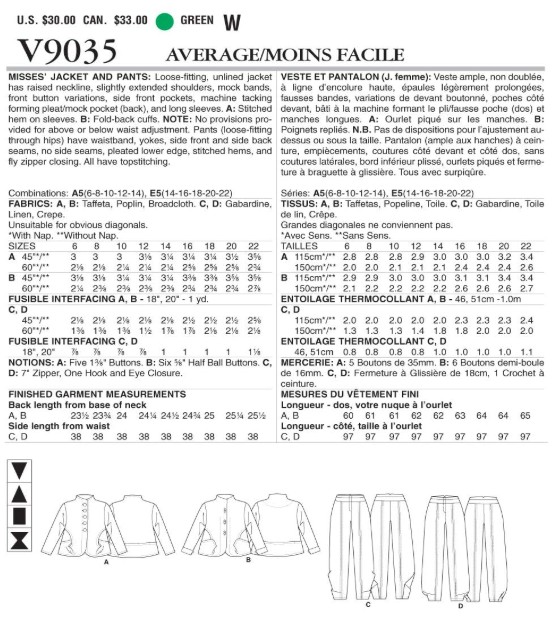 Misses' Jacket and Pants: Loose-fitting, unlined Jacket has raised neckline, slightly extended shoulders, mock bands, front button variations, side front pockets, machine tacking forming pleat/mock pocket (back) and long sleeves. A: stitched hem on sleeves. B: fold-back cuffs. Note: no provisions provided for above or below waist adjustment. Pants (loose-fitting through) hips have waistband, yokes, side front/side back seams, no side seams, pleated lower edge, stitched hems, and fly zipper closing. All have Topstitching.