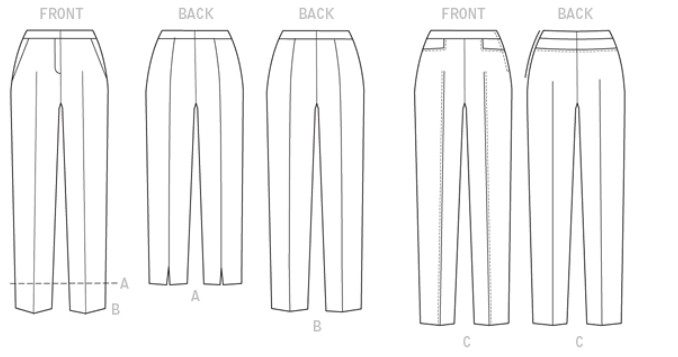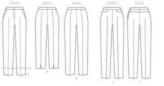 MISSES'/MISSES' PETITE PANTS: Semi-fitted, tapered pants have contour waistband with continuous binding, and side-front pocket variations. A: Back hemline slit and cropped capri-length. A, B: Inside button on waistband, fly zipper, and side-back seams. C: Inside button/bias loop on waistband, stitched crease, and invisible side zipper.