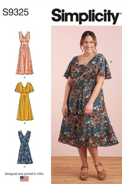 Misses' and women's relaxed over-the-head dress in three lengths has flutter sleeves, self ruffle detail or is sleeveless.