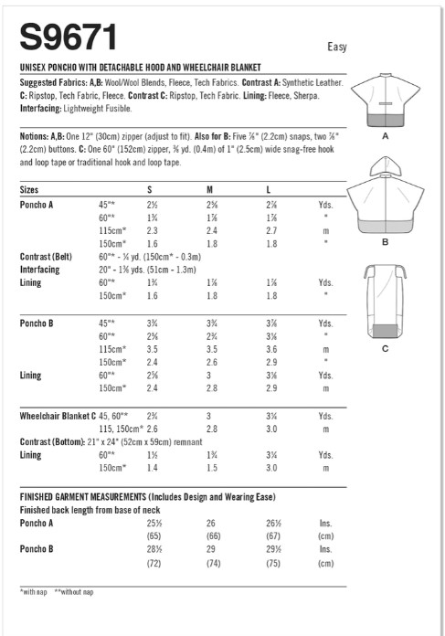 Ponchos have zip front opening. View A has a belt that ties at the waist. View B has side buttons, kangaroo pocket and detachable hood with large snaps. Wheelchair blanket has pockets on both sides of zipper front opening and hook and loop tape to attach to the chair back.