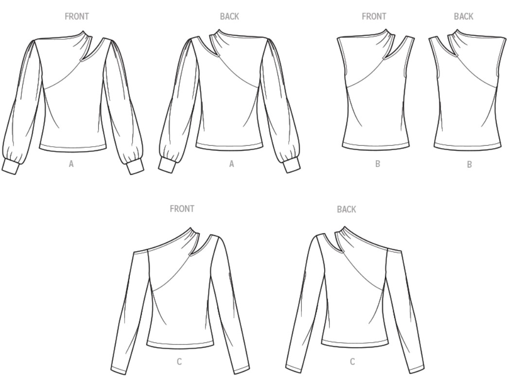 Knit tops have asymmetric cut-out along the shoulder for a sleek silhouette look. Top features long gathered sleeves with bands, long straight sleeves and sleeveless option.