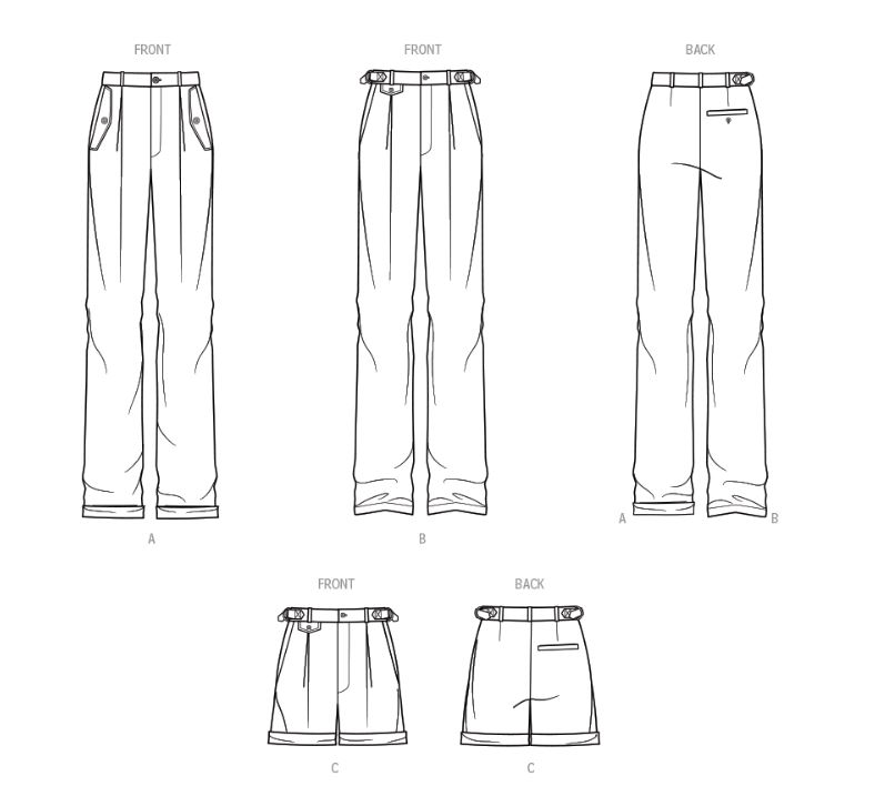 High-waisted fly front pants and shorts have front pleats and pockets. Views A and C have cuffs. Views B and C feature adjustable tabs at waist and front coin pocket.
