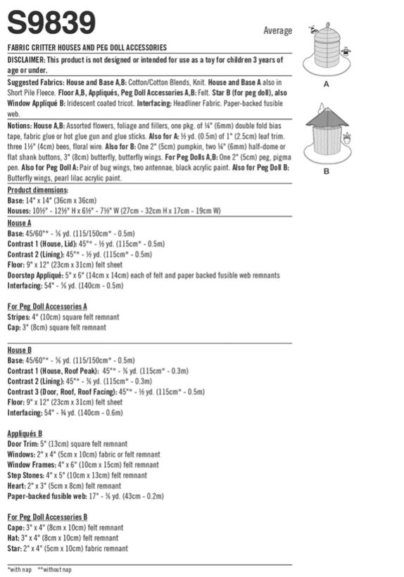 Simplicity sewing pattern for by Carla Reiss Design : Soft, quilted homes are lined with calico fabrics. Roof removes to play inside with peg dolls. Homes are sewn to a base and decorated with purchased bugs, vegetations, flowers and felt appliques. Great for stash bashing. Not intended as a toy.