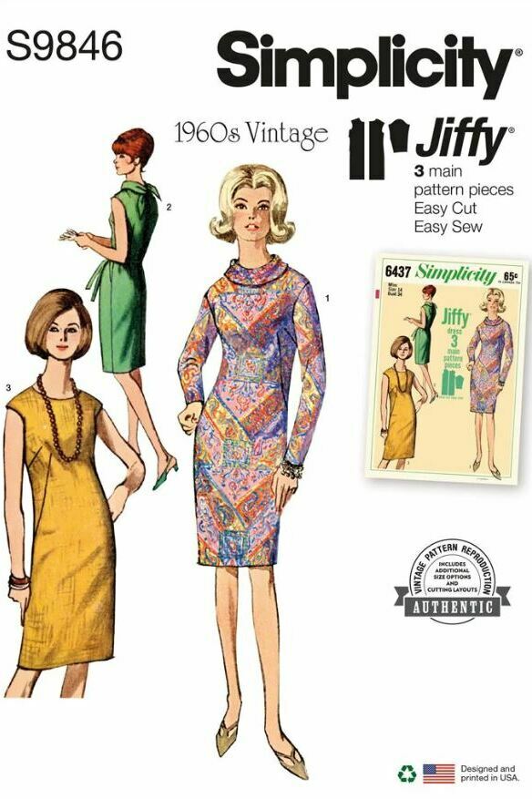 Vintage Simplicity 1960's Jiffy dress with three main pattern pieces. Simple to sew slim dress with high round neckline and back zipper has extended shoulder line and optional self tie belt. View 1 & 2 have a tie collar. View 1 has long set-in sleeves. View 2 & 3 are sleeveless. Authentic Vintage Reproduction includes additional sizes and cutting layouts.